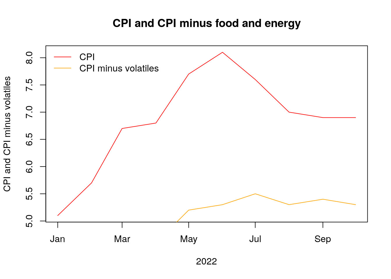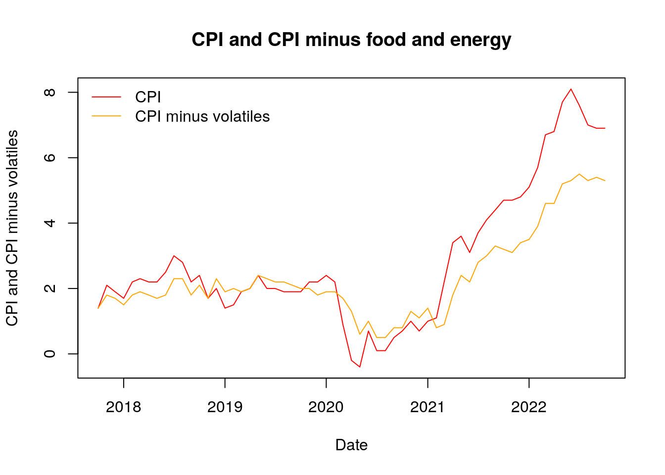 legend("topleft", bty = "n",legend = c("CPI", "CPI minus volatiles"), col = c("red", "orange"), lty = 1)